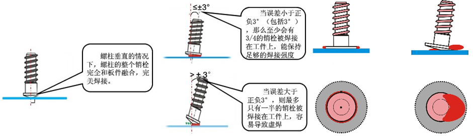 ■螺柱伸出长度——螺柱伸出长度对于长周期螺柱焊来说,是螺柱熔化的长度与工件熔池深度之和,与螺柱直径成正比,经验值在1.5~6mm;对于短周期螺柱焊接而言,电磁式焊枪的螺柱伸出长度是螺柱熔化的长度加工件熔深,通常为1.2mm;伺服电机式焊枪的螺柱,其伸出枪嘴端面一定的长度,仅仅是便于螺柱与工件接触,而形成稳定的电路短路,通常为2.2~3mm。伺服电机式焊枪的螺柱熔化长度与工件熔池深度为单独的参数值,与螺柱伸出长度没有直接关系。
